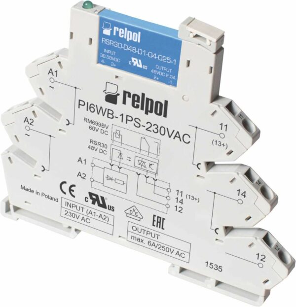 PIR6WB-1PS-24VAC/DC-T, 1 NO, triac-utgång. Spänningsspole 24 V AC/DC. Märklast AC1 1 A. Montering: montering på 35 mm skena. Kapslingsklass IP 20.