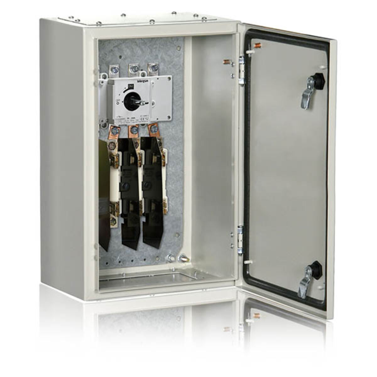 Frånskiljare tillgängliga från 40 till 1600A i versionerna 3P, 3P + N, i metallkapsling eller polyesterkapsling med eller utan säkringssockel enligt modell IP65. Externt hänglåsbart handtag som ser dörren i läge ON I. Dörröppningen blockeras av hänglåset när handtaget är i läge OFF 0. Externt kopplingsläge på dörren.